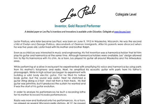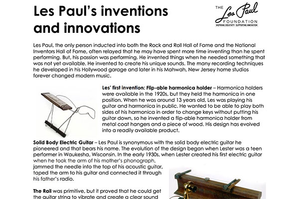 The Les Paul Foundation Video Series (LPF) provides an introduction to the innovative work of Les Paul. Discuss, explore, and apply each video’s topic through the educational activities within the LPF Video Series link.